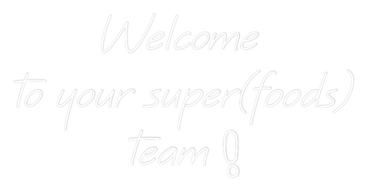 Text: Welcome to your super(foods) team ExclaimMark Line 1: Welcome Schriftart: Beachfront Wähle eine Farbe: Orange Line 2: to Schriftart: Beachfront Wähle eine Farbe: Orange your Schriftart: Beachfront Wähle eine...